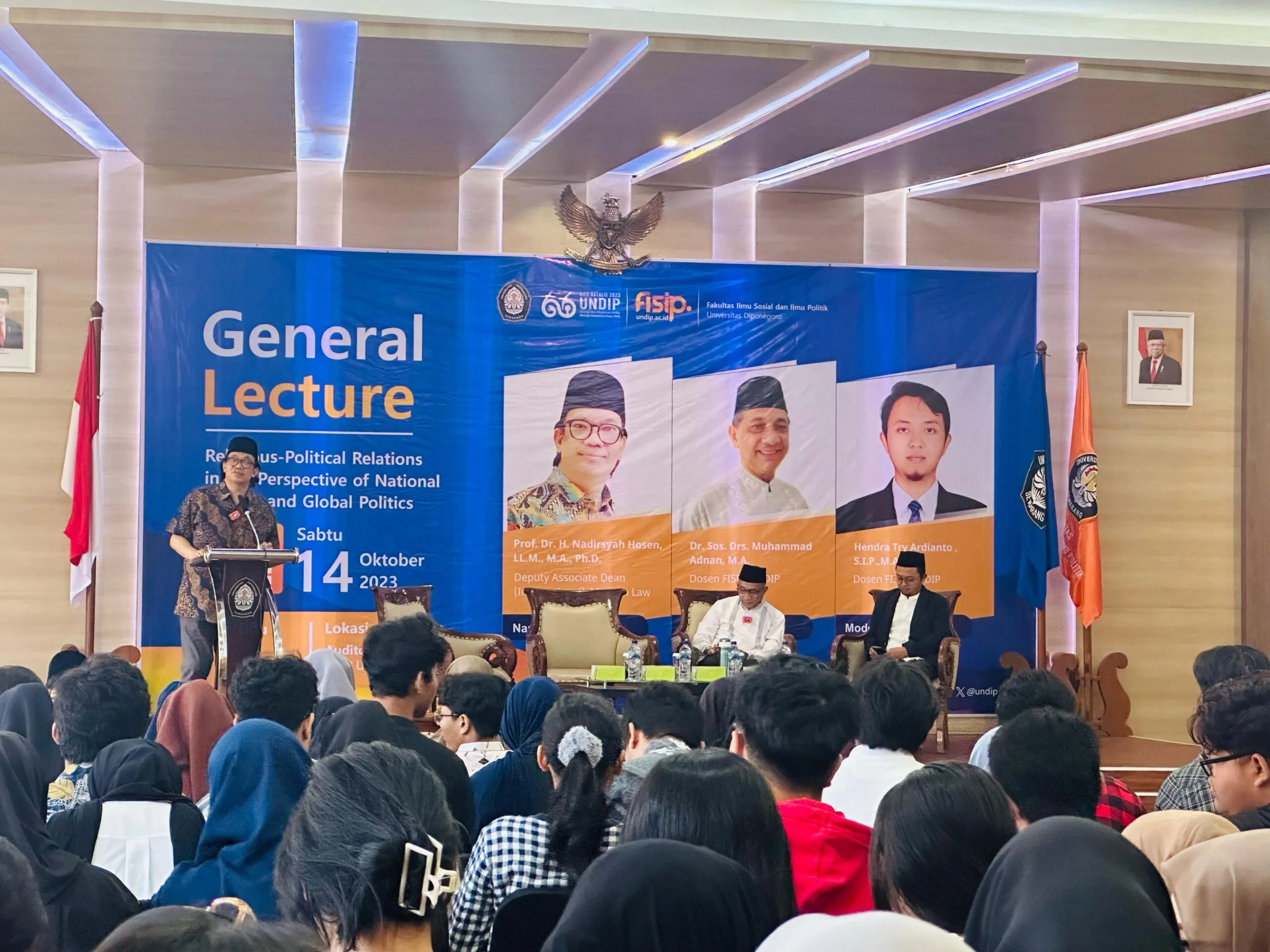 Semarang (14/10) – The International Office of the Faculty of Social and Political Sciences at Universitas Diponegoro organized a General Lecture with the theme “Political and Religious Relations in the Perspective of National and Global Politics.” The general lecture was delivered by Deputy Associate Dean-International of Monash University, Prof. Dr. Nadirsyah Hosen, LL.M., M.A., Ph.D. Dr. Drs. Muhammad Adnan, M.A. also participated as a discussant in the general lecture.