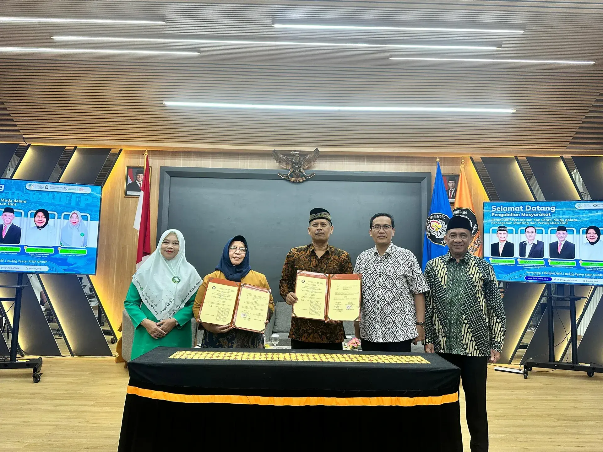 Semarang, 4 Oktober 2025 – Berkolaborasi dengan Kementerian Kependudukan dan Pembangunan Keluarga/Badan Kependudukan dan Keluarga Berencana Nasional (Kemendukbangga/BKKBN), Fakultas Ilmu Sosial dan Ilmu Politik Universitas Diponegoro (FISIP UNDIP) menggelar seminar bertajuk “Peran Aktif Perempuan dan Santri Muda dalam Pencegahan Stunting dan Pernikahan Dini”. Kegiatan tersebut turut dihadiri oleh Sekretaris Kemendukbangga/BKKBN, Prof. Budi Setiyono, M.Pol.Admin, Ph.D, serta tiga narasumber lain yakni Kepala BKKBN Provinsi Jawa Tengah, Eka Sulistia Ediningsih, S.H, Dosen sekaligus Pengasuh Pondok Pesantren Kebangsaan, Dr. Drs. Muhammad Adnan, M.A, serta Ketua Pimpinan Cabang Fatayat Nahdlatul Ulama Kota Semarang, Hj. Istighfaroh, M.Pd.